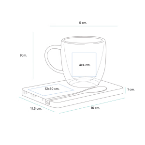 Juego de té, incluye taza fabricada en borosilicato, con base y cuchara fabricadas en madera de bambú barnizada. Capacidad de 250 ml.